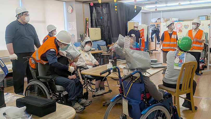 車いすの方を避難誘導するのは人手が必要です。館内で活動している他事業所の方々に協力のお願いをして1階まで下ります。訓練を重ねることで、ご利用者の安心と職員の心がまえにつながっていると思います。
