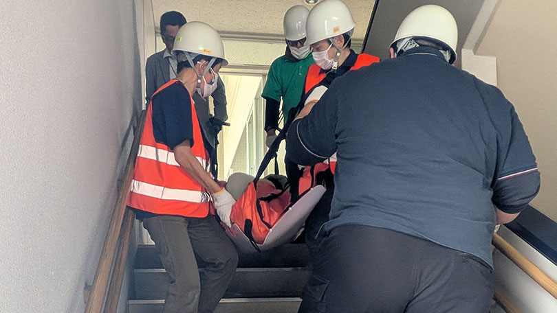 ポンテで防災訓練を実施しました。地震でエレベーターが止まりご利用者をエアストレッチャーに乗せて階段を下りる訓練です。あいとぴあセンターの4階にあるポンテは避難が大変です。