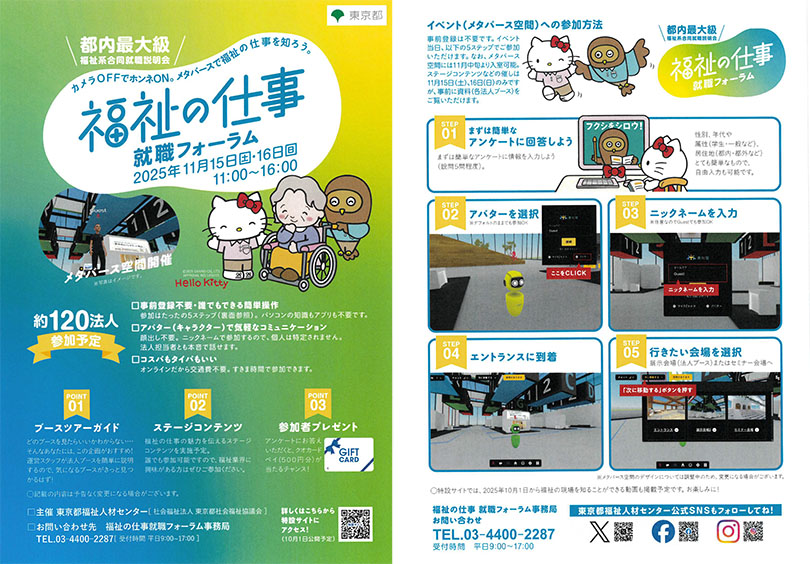 11月15日(土)・16(日) に開催の「福祉の仕事就職フォーラム」に参加致します。 2025 10/04 EVENT 今回はメタバース空間でのオンライン開催です。詳細は特設サイトよりご確認ください。社会福祉法人足立邦栄会のブースへのお越しをお待ちしております。下の画像をクリックするとPDFが開きます。 EVENT グループホームパンダ 世話人 ◆ アルバイト・パート◆未経験歓迎◆週1日〜OK◆定年後の方活躍中◆見学歓迎(kom026p) グループホームえだまめ 生活支援員 ◆ アルバイト・パート◆Wワーク歓迎◆残業ほぼなし◆見学歓迎◆(kom003p)