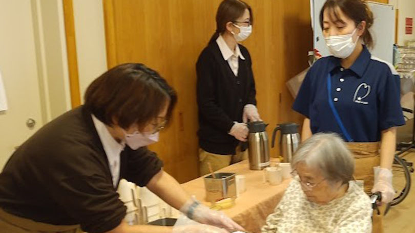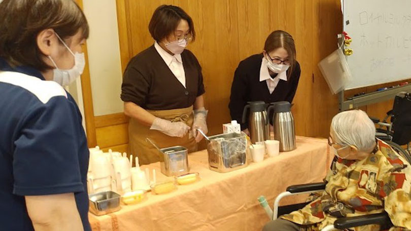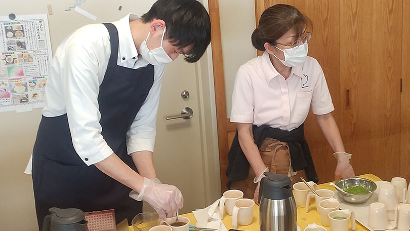 毎月のお楽しみ企画「さくらカフェ」では、普段は裏方の厨房職員や事務職員が介護職員とともにご利用者をおもてなし!ホットチョコレート、抹茶、ホットカルピス、ロイヤルミルクティーなどのなかからお好きな飲み物を選んでいただき、心を込めてお出しします。